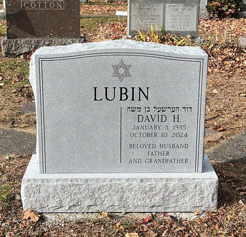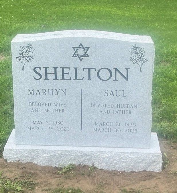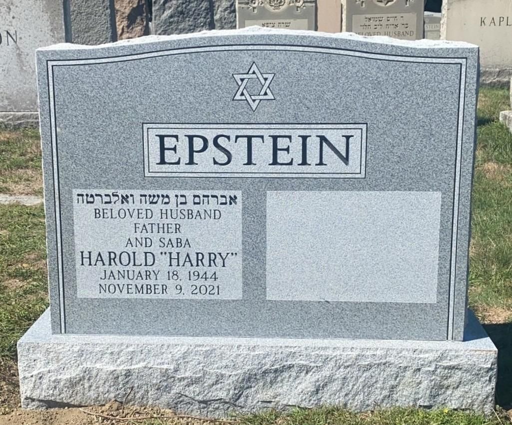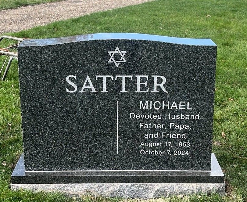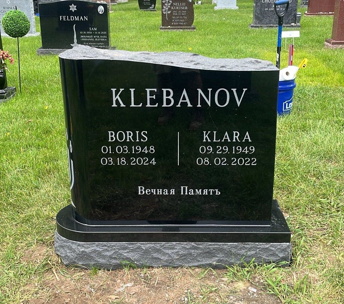 Jet Black Granite. Polished front, back and top with natural sides and a serpentine top. Shallow scooped last name and Hebrew prayer. Frosted panel with sandblast lettering and sunk emblems.Â
