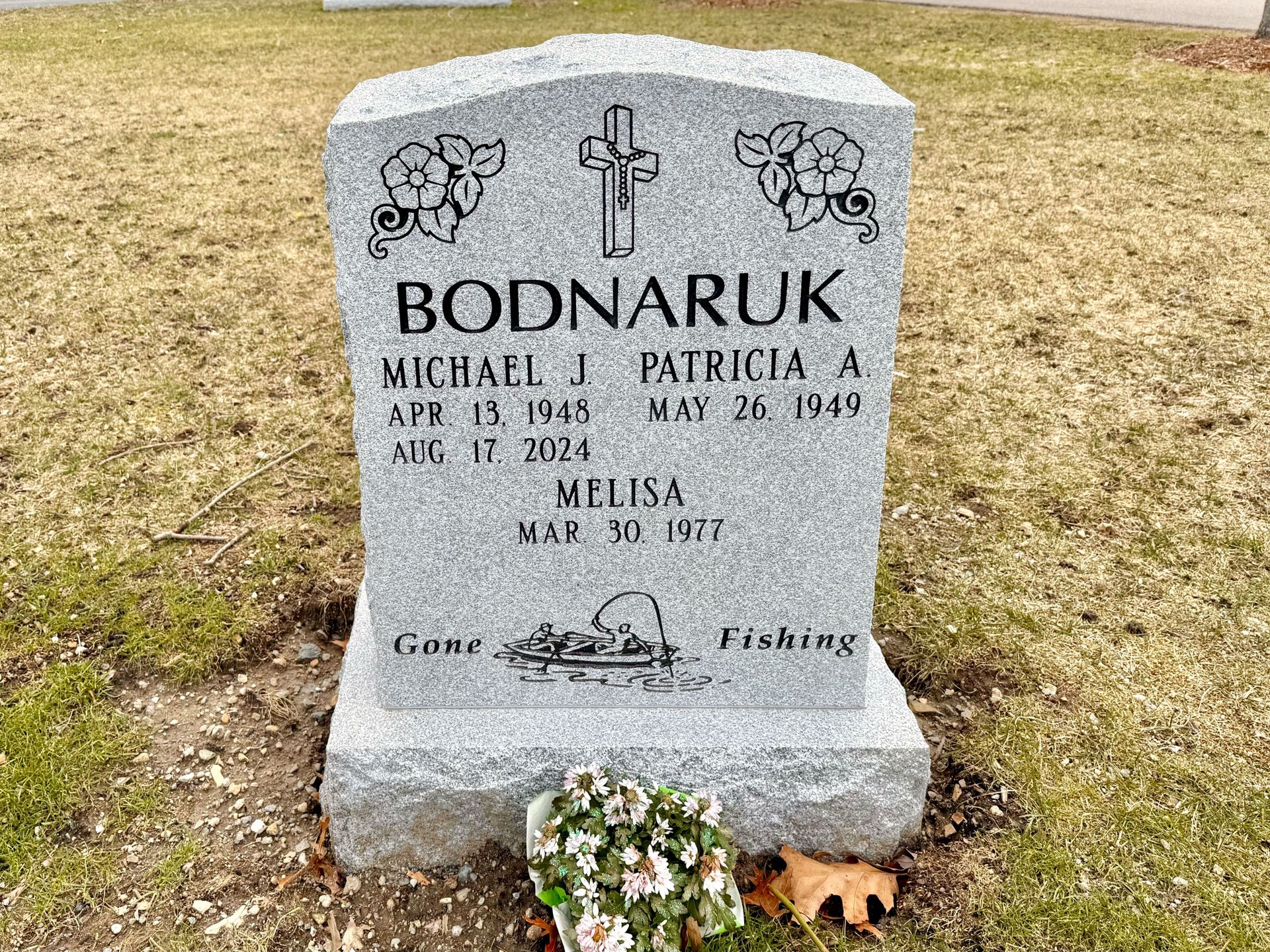 Georgia Gray Granite. Polished front and back, natural top and sides with a serpentine top. Sandblast lettering and flat flowers.Â
