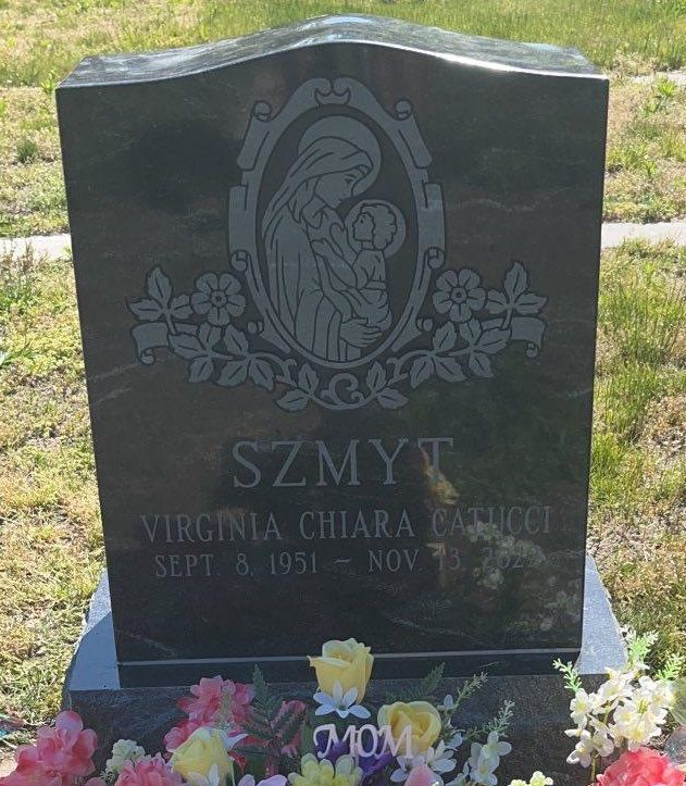 Georgia Gray Granite. Polished front and back, natural top and sides with a serpentine top. Sandblast lettering. Recessed ceramic picture.Â