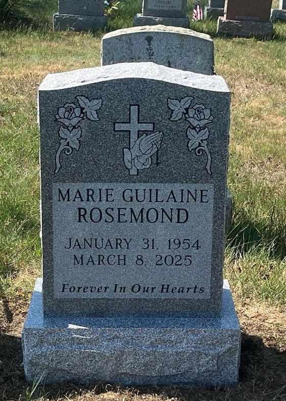 Barre Granite. Polished front and back, natural top and sides with a serpentine top. Flat flowers. Sandblast lettering.Â