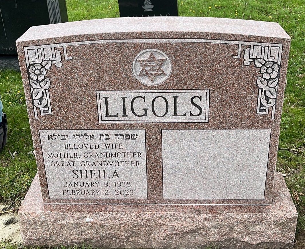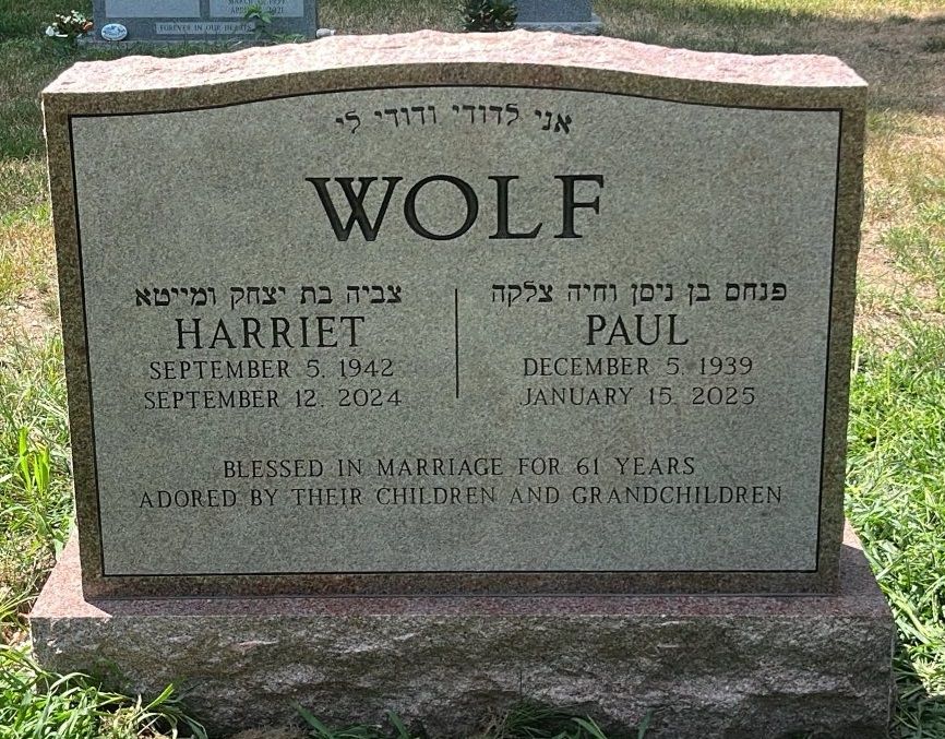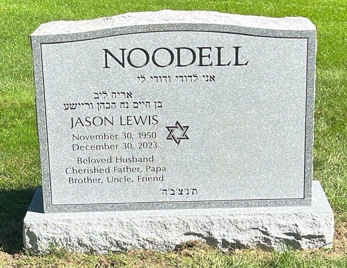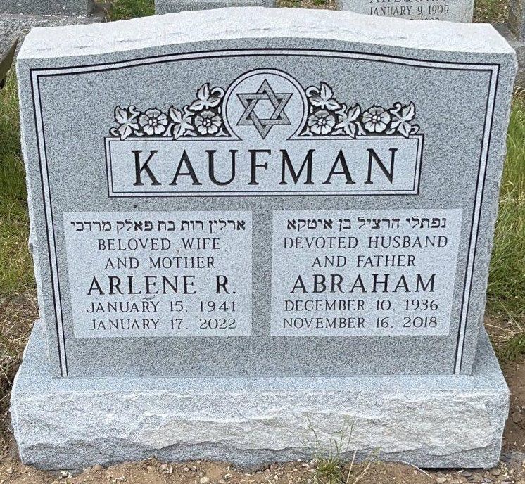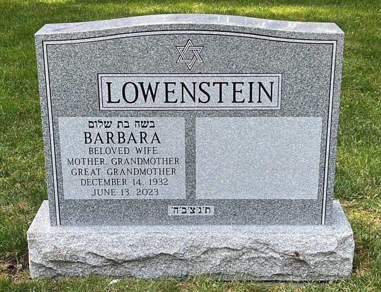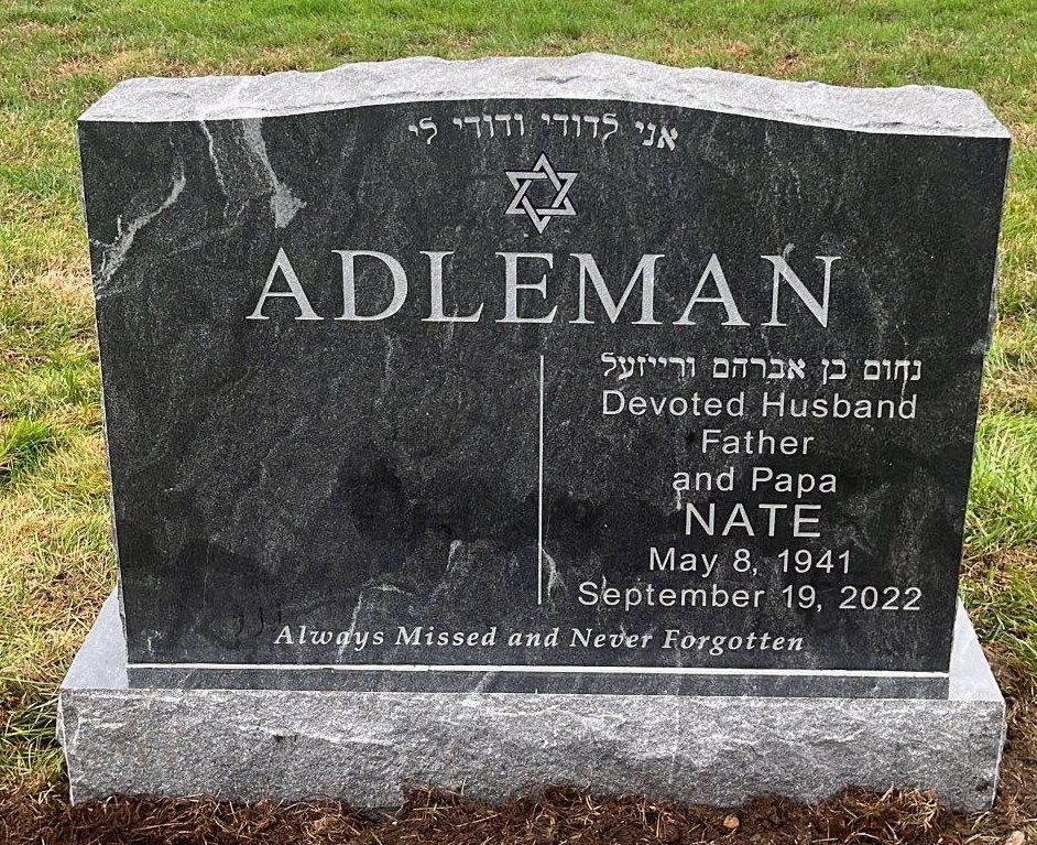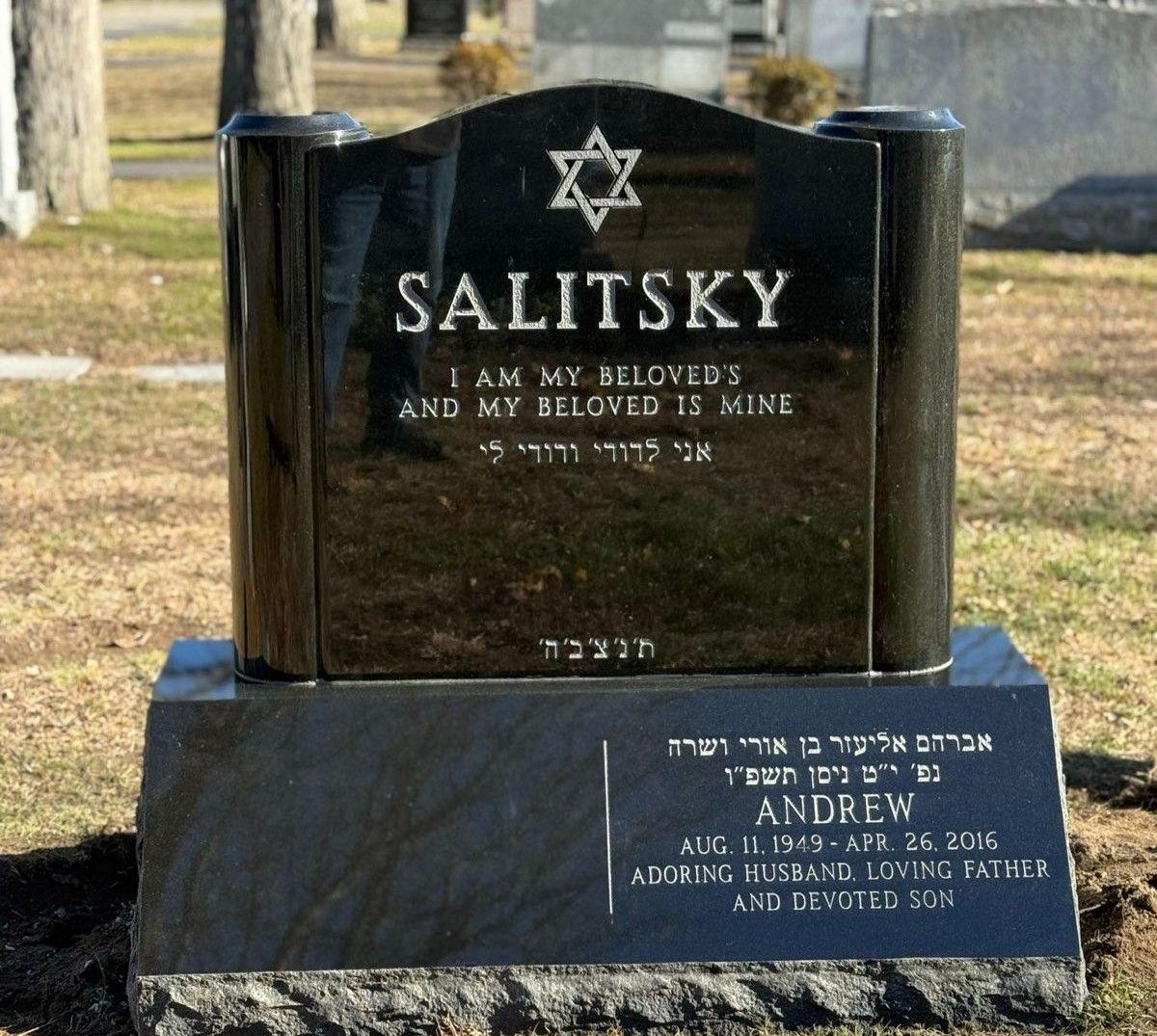 Jet Black Granite. Polished front, back and top with natural sides and a serpentine top. Shallow scooped last name and Hebrew prayer. Frosted panel with sandblast lettering and sunk emblems.Â